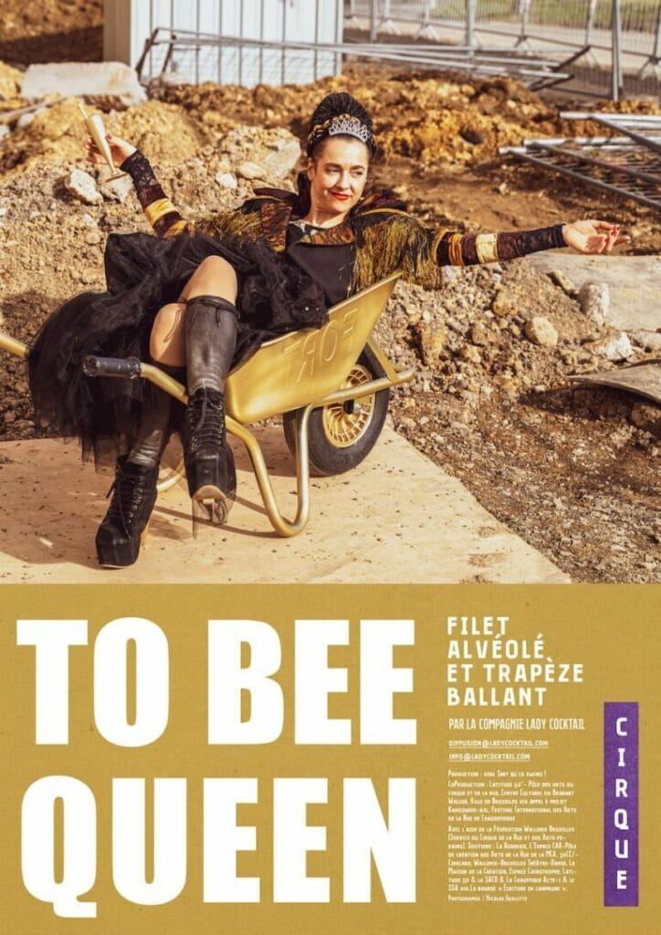 To Bee Queen par la compagnie La Butineuse : Nous sommes dans une ruche, la reine débarque, accompagnée de son valet, parmi ses abeilles (le public) pour une réunion d’urgence syndicale Les abeilles sont en grève, elles réclament une redistribution équitable de gelée royale pour toute la ruche… Au programme : débat acrobatique et trapèze libérateur. Comment cette reine à la noblesse discutable s’en sortira-t-elle face à la révolte de la plèbe ?