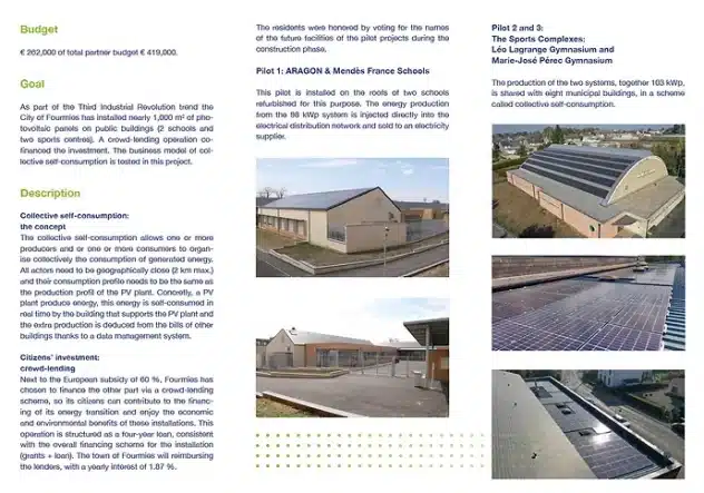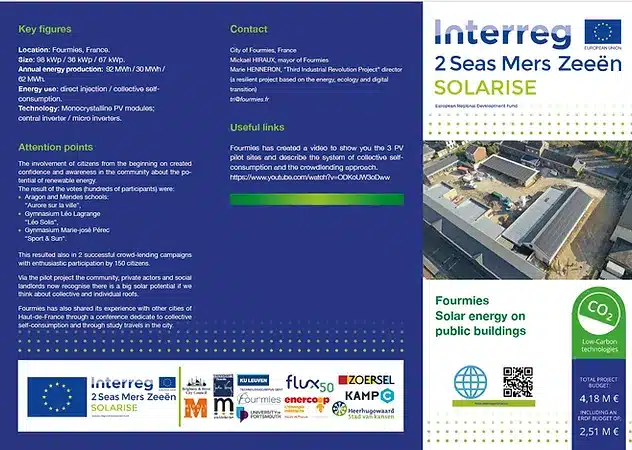 La Ville de Fourmies a installé plusieurs centrales photovoltaïques sur les toitures des bâtiments communaux. Les premières centrales ont été financées en partie par une campagne de financement participatif afin de permettre aux habitants de participer au projet. L’opération a été un véritable succès : 104 800€ récoltés grâce à la participation de 183 personnes. Cette opération a également été financée par la Région Hauts-de-France et le programme européen Solarise Interreg.